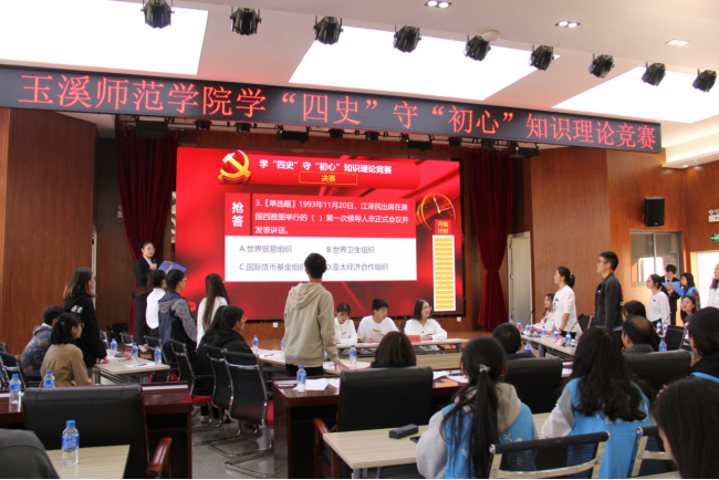 为深入贯彻落实习近平总书记关于“四史”学习的重要指示精神,积极引导和激励新时代大学生深入学习“四史”,持续深化爱国主义教育、厚植家国情怀、勇担时代责任。2020年11月22日,由共青团玉溪师范学院委员会主办、共青团玉溪师范学院马克思主义学院委员会承办以“学四史、守初心”为主题的 “四史”知识理论竞赛活动在学校大学生活动中心会堂圆满落幕。
