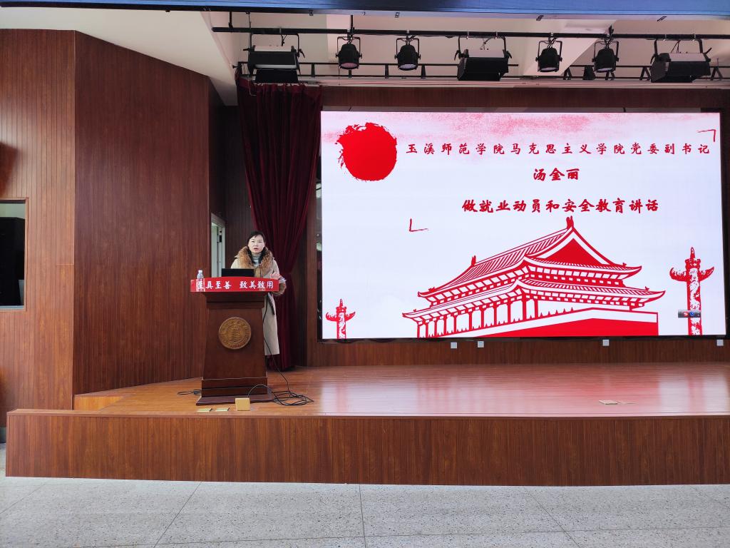学院党委副书记汤金丽在2021届毕业生就业动员讲话时强调,目前从国家、云南省及玉溪市三个层面释放出来的就业政策和信息,2021年的就业形势依然严峻,希望同学们要正确评估自己,主动获取就业信息,坚持先就业后择业,竭尽所能争取好的就业岗位。同时,汤金丽副书记代表学院党政领导班子预祝学院全体师生新年快乐、再创佳绩!希望全体师生在元旦和春节假期要注意人身安全,严格遵守国家法律、校规校纪和疫情防控有关规定,为2020年画上一个圆满的句号。