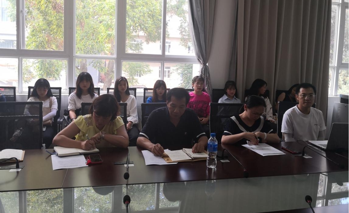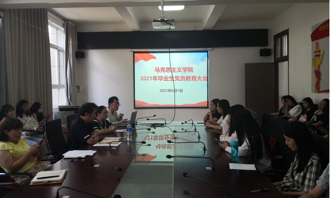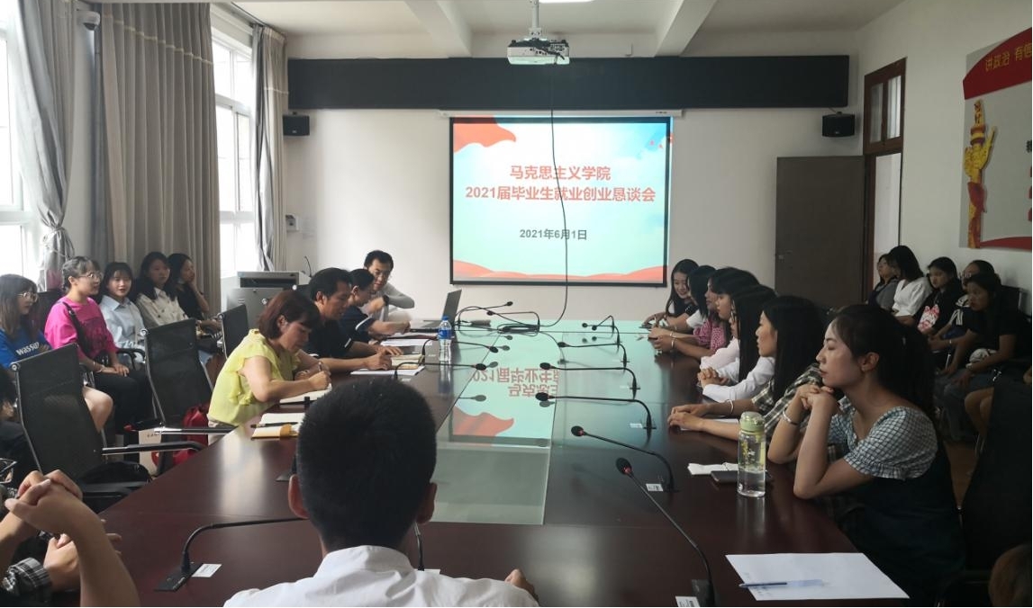 6月1日下午,马克思主义学院在第二教学楼316党员活动室召开2021届毕业生就业创业工作恳谈会暨毕业生党员教育大会。会议学院党委委员、学生党支部书记段妍智主持,学院党委书记田志忠、院长助理杨少英、专职组织员朱俊龙、辅导员李铁和2021届全体毕业生参加会议。
