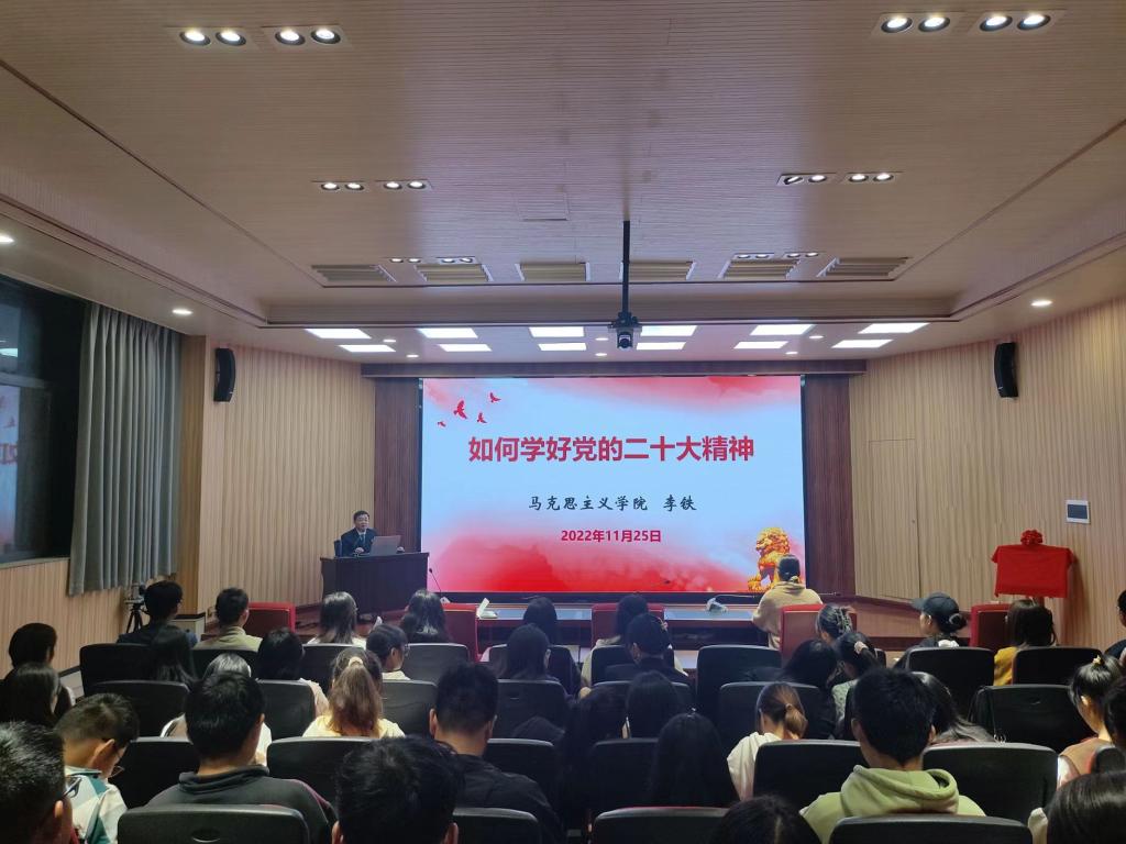 学报告、悟思想,谈体会、谋落实。为深入学习贯彻落实党的二十大精神,马克思主义学院于2022年11月25日19:00在学院一楼报告厅开展学习党的二十大精神专题讲座。本次讲座由辅导员梁亚萌主持,特邀学院党委副书记李铁进行专题讲授,讲座主题为“如何学好党的二十大精神”。全体学生党员及团员代表一起参加此次讲座。