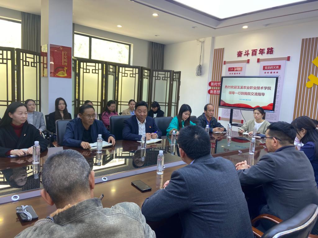 2024年2月26日下午,玉溪农业职业技术学院马克思主义学院一行二十多名教师在学校党委书记柏家渭、党委宣传部部长杨睿、马克思主义学院院长李雪娟的带领下到我院开展交流合作。我校党委副书记杨光、学院班子成员及部分教师陪同调研并参加座谈会。