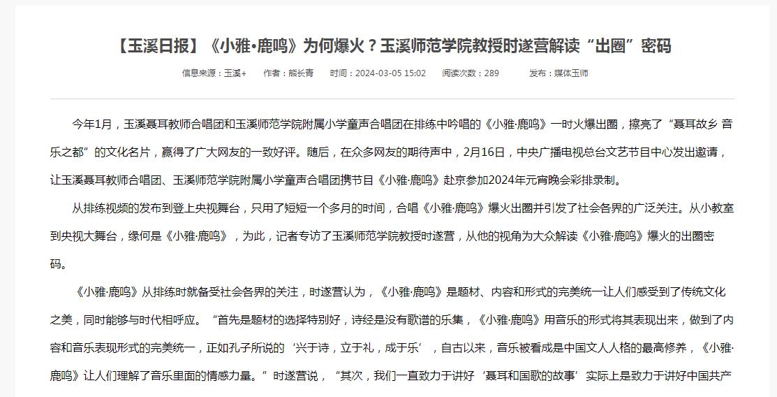从排练视频的发布到登上央视舞台,只用了短短一个多月的时间,合唱《小雅·鹿鸣》爆火出圈并引发了社会各界的广泛关注。从小教室到央视大舞台,缘何是《小雅·鹿鸣》,为此,记者专访了玉溪师范学院教授时遂营,从他的视角为大众解读《小雅·鹿鸣》爆火的出圈密码。