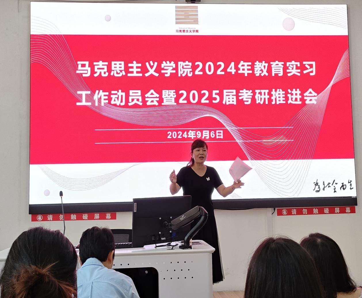 为做好2021级思想政治教育专业的教育实习工作,推进2025届考研工作有序开展,9月6日下午14:30,马克思主义学院于14教103开展了2024年教育实习工作动员会暨2025届考研推进会,本次会议由政教本科21-1班班主任张馨月老师担任主持,2021级全体同学及部分实习考研指导教师参加。