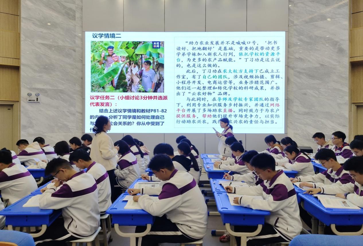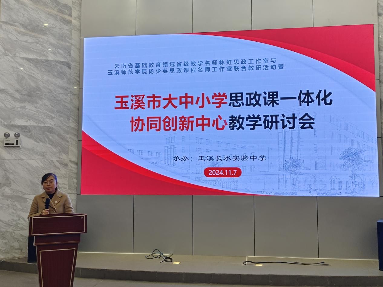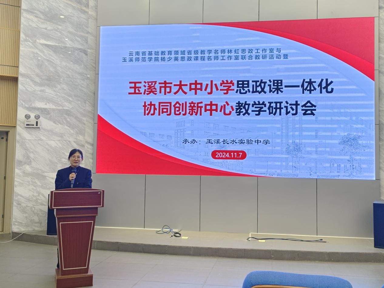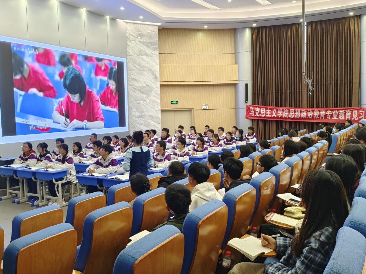 为统筹推进玉溪市大中小学思政课一体化建设,切实发挥思政课立德树人关键课程的作用,提升思想政治教育专业师范生教育教学能力,全面增强思政育人效果。借助玉溪市大中小学思政课一体化协同创新中心教学研讨会契机,云南省基础教育领域省级教学名师林虹思政工作室与玉溪师范学院杨少英思政课程名师工作室,于2024年11月7日下午在玉溪长水实验中学开展高中思政课同课异构联合教研活动。马克思主义学院2022级思想政治教育专业师生到现场观摩学习,开展高中学段教育见习。