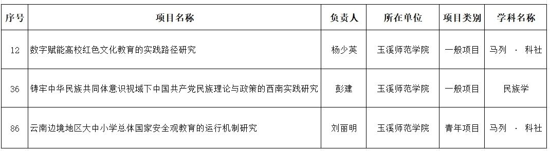 2024年8月至今,我院四位教师项目获立2024年度云南省哲学社会科学项目立项。其中,云南省哲学社会科学规划项目获立3项,分别是杨少英教授《数字赋能高校红色文化教育的实践路径研究》、彭建博士《铸牢中华民族共同体意识视域下中国共产党民族理论与政策的西南实践研究》;刘丽明博士《云南边境地区大中小学总体国家安全观教育的运行机制研究》。刘昱均博士《心理科普:如何建立良好的亲子关系》获立云南省哲学社会科学规划科普项目。