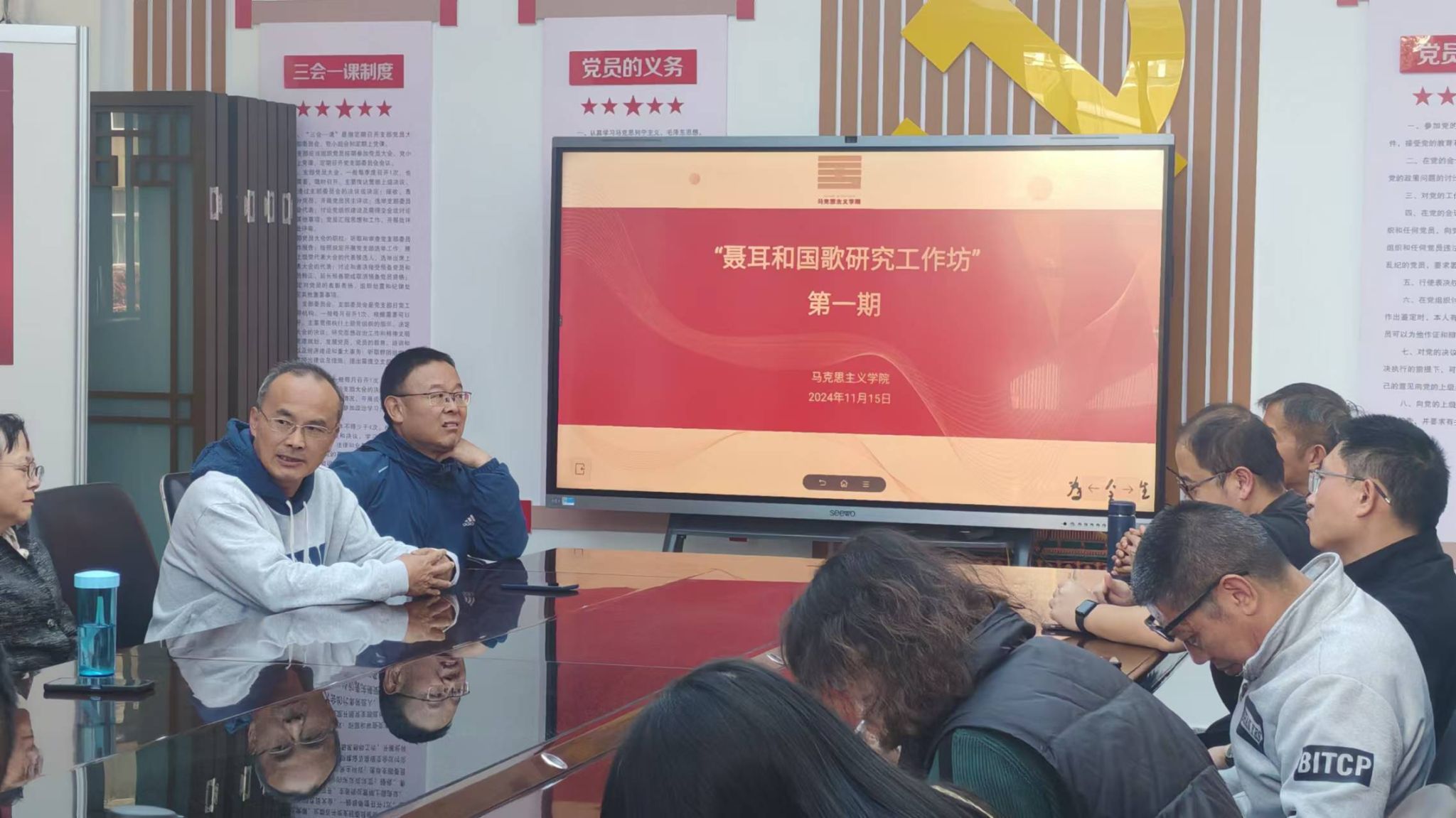 为提升学院教师在课题申报、论文写作以及政策解读等方面的能力,加强教师之间的经验交流,进一步提高学院科研水平,推动科研工作迈向新台阶。2024年11月15日,马克思主义学院第一期“聂耳和国歌研究工作坊”于三楼会议室顺利开展。本次活动由我院获立2024年国家社科基金青年项目的彭建博士主持,学院全体教师参加。