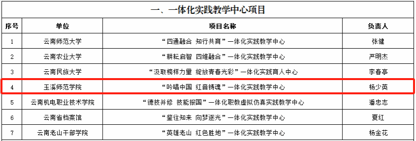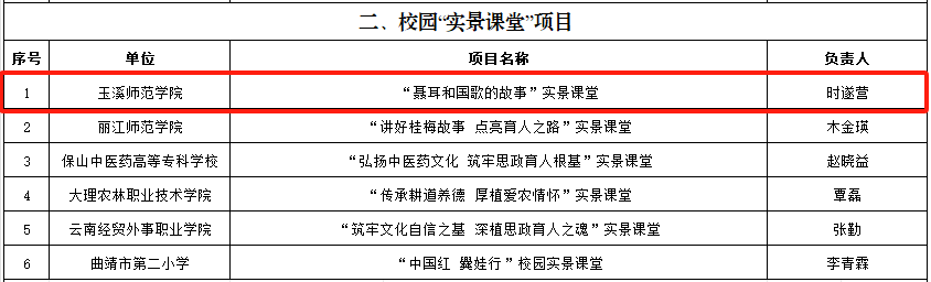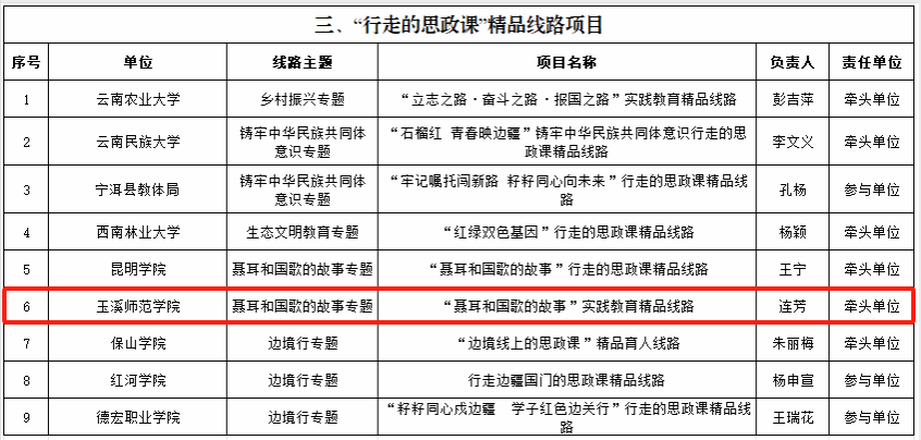 为贯彻落实全国和全省新时代学校思政课建设推进会精神,统筹推进新时代云南省大中小学思政课一体化建设“四通行动”,省委教育工委组织开展了云南省大中小学思想政治教育一体化实践教学项目申报工作。经单位申报、专家评审、网上公示等程序,遴选出22个入选项目,我院时遂营教授《“聂耳和国歌的故事”实景课堂》入选校园“实景课堂”项目;杨少英教授《“吟唱中国 红音铸魂”一体化实践教学中心》入选一体化实践教学中心项目;连芳副教授《“聂耳和国歌的故事”实践教育精品线路》入选“行走的思政课”精品线路项目。
