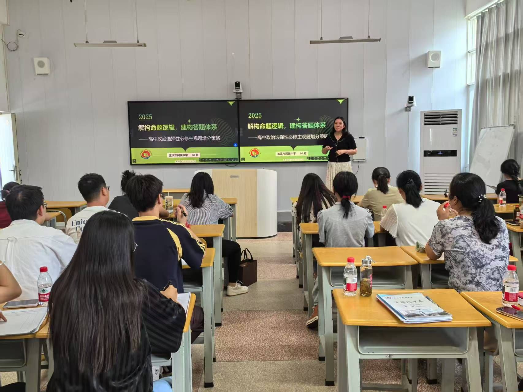 2025年5月13日至14日,玉溪师范学院马克思主义学院思想政治学科教学论教师、云南省一流本科课程《学科教学技能训练》主持人杨少英教授,携手玉溪市民族中学正高级教师、云南省基础教育领域省级教学名师林虹老师,赴西双版纳州勐海一中、景洪四中开展新高考政治学科送教活动。此次活动以“资源共享、精准赋能”为目标,通过示范课展示、专题讲座与深度教研交流,助力边疆地区新高考改革落地,彰显一流课程建设的实践价值与社会担当。