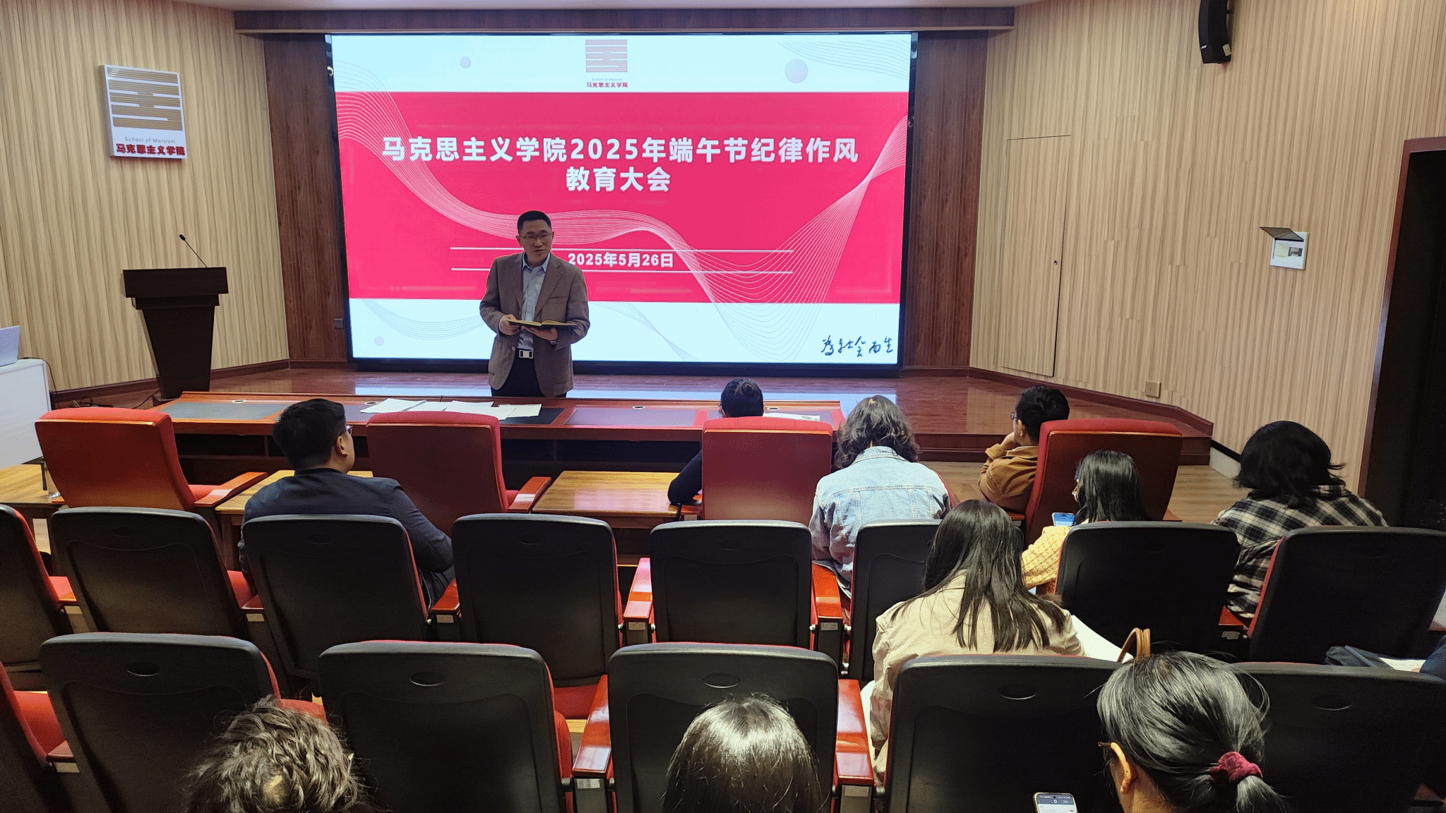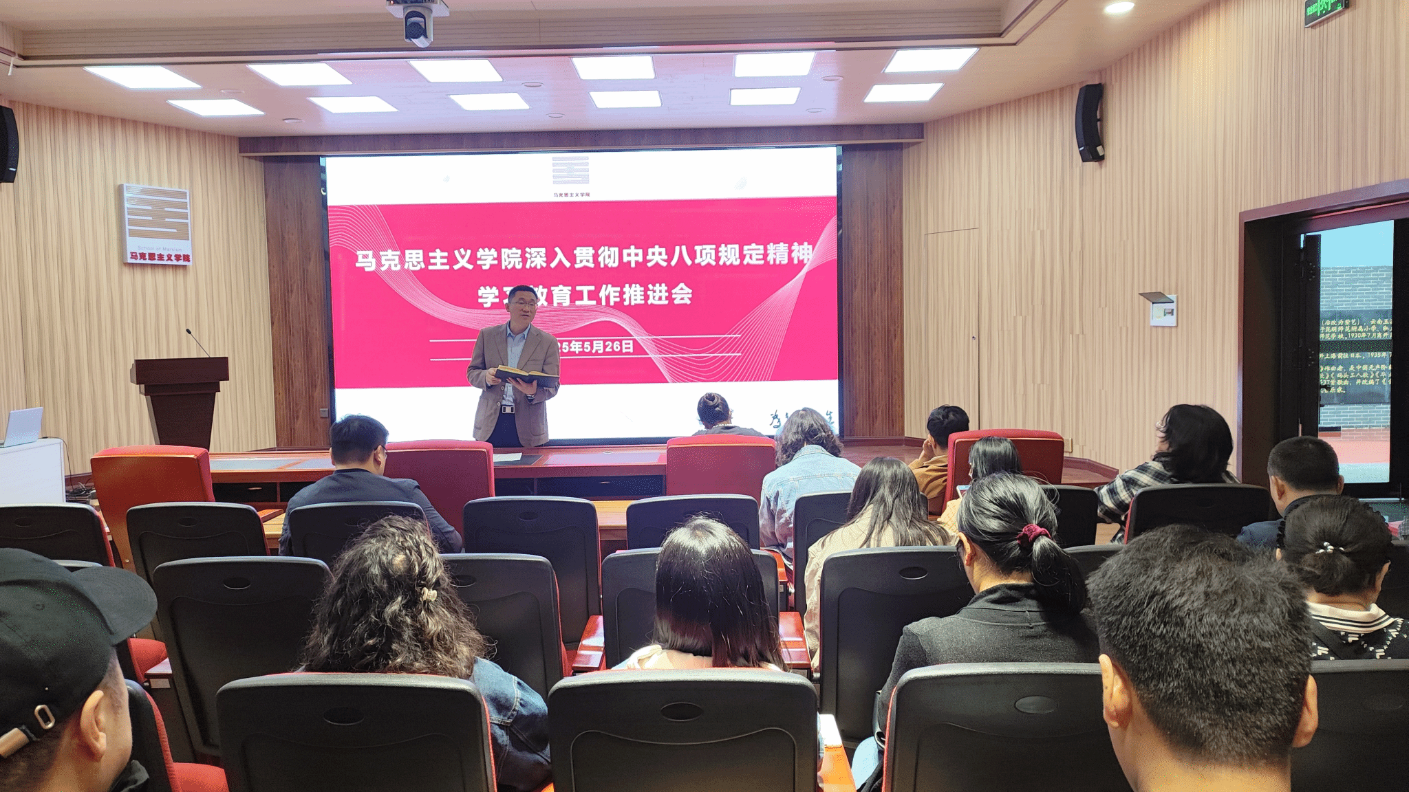 2025年5月26日下午,马克思主义学院在四耳报告厅召开深入贯彻中央八项规定精神学习教育工作推进会暨2025年端午节纪律作风教育大会。会议由学院党委书记罗辉主持,全体教职工参加会议。