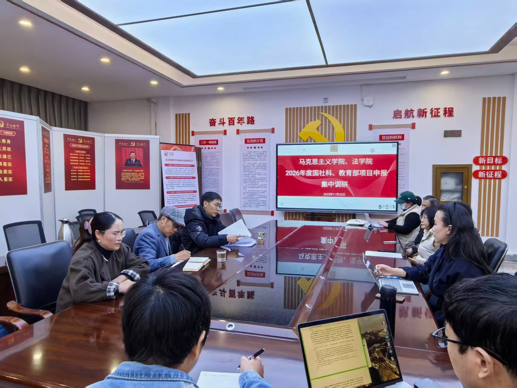 为提升二级学院国家社科基金、教育部人文社科项目申报能力,切实改进2026年课题申报质量,2025年11月20日,玉溪师范学院科研处处长赵永胜莅临马克思主义学院,对2026年课题申报工作开展集中调研与指导,十多位老师参加此次调研指导工作会。