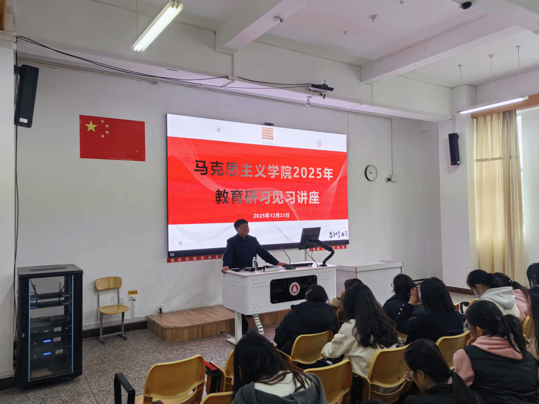 2025年12月23日,马克思主义学院组织思想政治教育专业2022级、2023级全体学生参加教育见习、研习专题学术讲座。本次讲座特邀玉溪市红塔区教科所所长、正高级教师朱培昌老师担任主讲人,由专业负责人刘丽明老师主持。