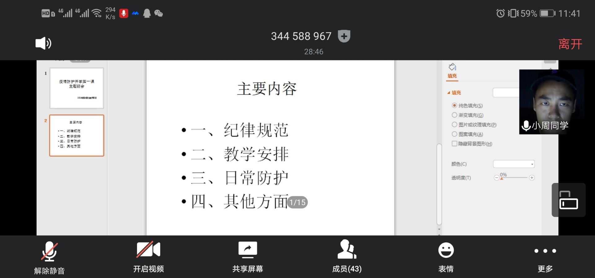 为认真贯彻落实习近平总书记关于坚决打赢疫情防控阻击战的重要指示精神,贯彻党中央、国务院决策部署,落实省委、省政府和市委、市政府有关工作要求,推行学校开学学生教学管理的方案。2019级思想政治教育二班于2020年5月24日晚十一点在腾讯会议平台上召开了疫情防控开学第一课线上主题班会,此次班会由班主任周鑫老师主持。