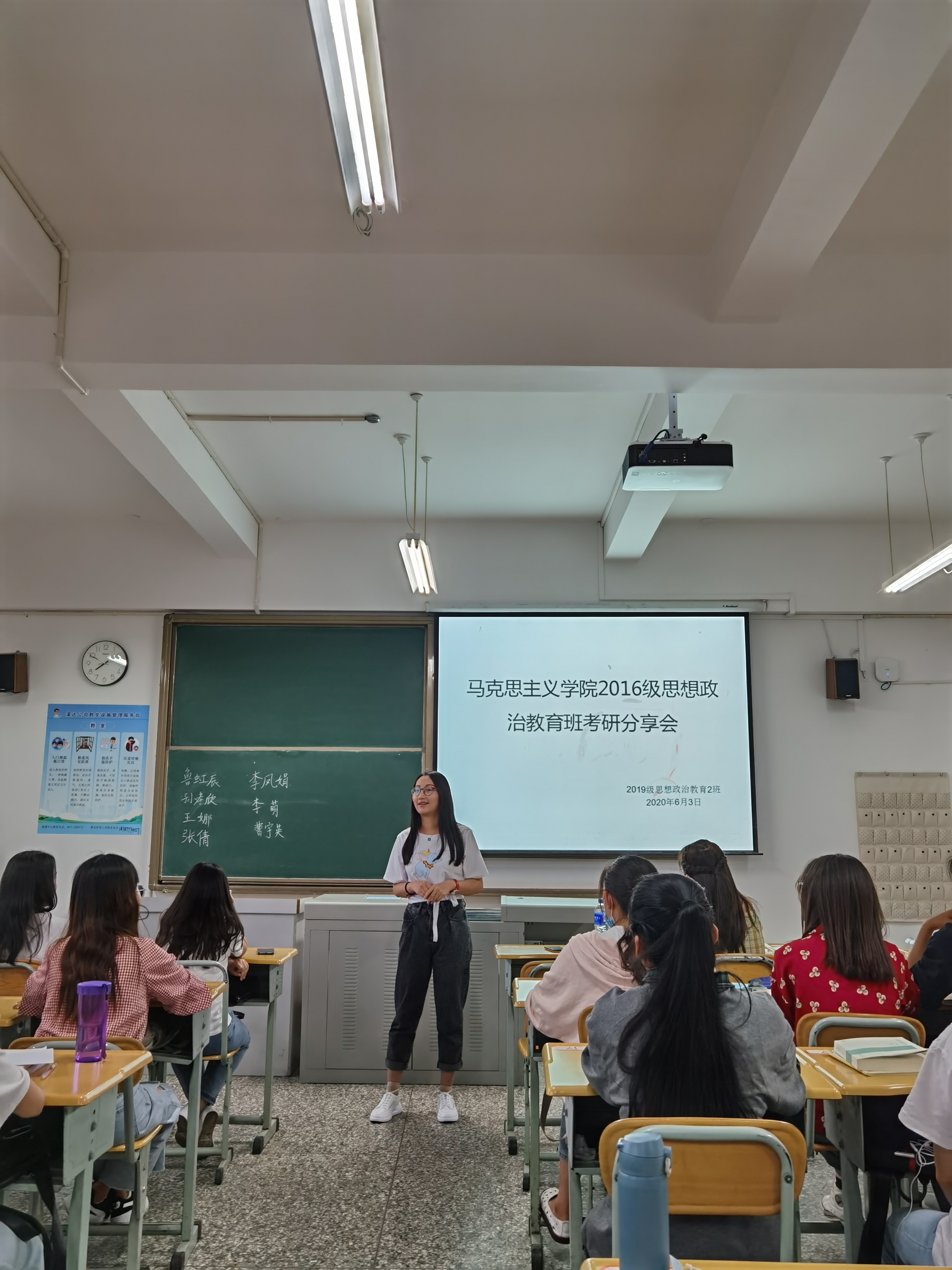 本次会议由班主任周鑫老师主持,2019级思想政治教育二班的全体同学参加。本次分享会有幸邀请到了即将离校的2016思想政治教育班的七位考研成功的同学(鲁虹辰、李凤娟、曹宇英、李萌、孙孝欣、张倩、王娜)分享考研心得。