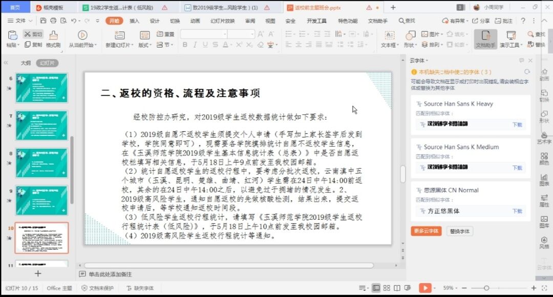 本次会议围绕着“认真自我排查,健康安全返校”展开,具体说明了“疫情防控仍然不可松懈”、“返校的资格、流程及注意事项”、“自愿不返校的注意事项”、“返校前的过渡活动”、“其他注意事项”五个方面。