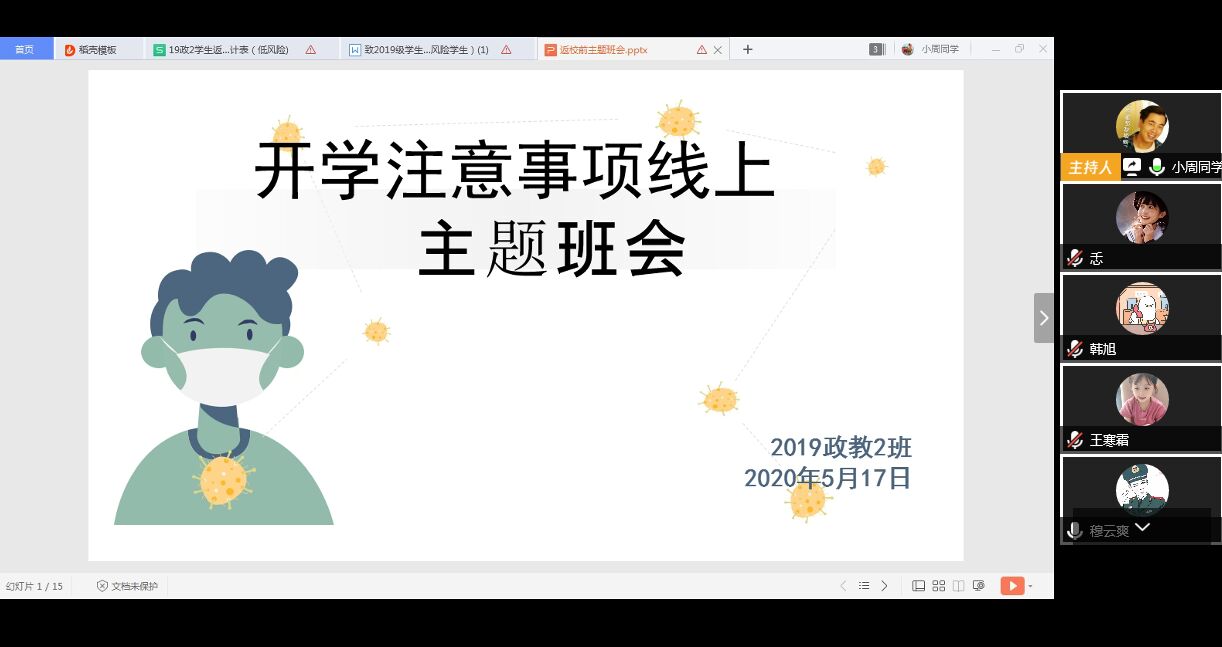 为了提高同学们的安全意识,帮助大家树立新学期的奋斗目标,进一步推动班级学风建设,营造良好的学习环境,2020年5月17日晚九点,19级思想政治教育二班全体同学在班主任周鑫老师的主持下,于腾讯会议平台召开了“开学注意事项线上主题班会”。