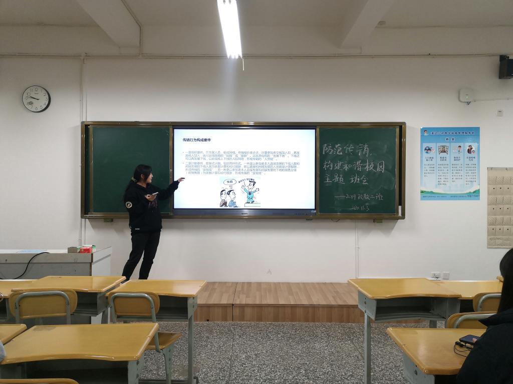 班会伊始,李函容同学介绍了什么是传销以及说明了传销的几个特征。其次简单介绍了传销行为构成的两个要件和传统传销拉人布局的六个过程。然后列举了传销的种类:异地聚集式传销、“拉人头”传销、收取“入门费”传销、“团队计酬”传销、“1040工程”传销、“纯网式”网络传销,让同学们更加深入地认识传销手段。最后李函容同学介绍了避免陷入传销陷阱的六个方法,警示同学们要防范于未然。