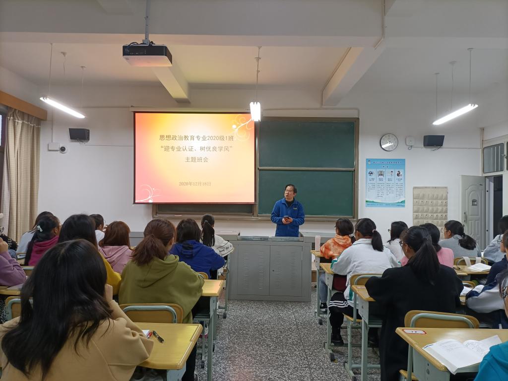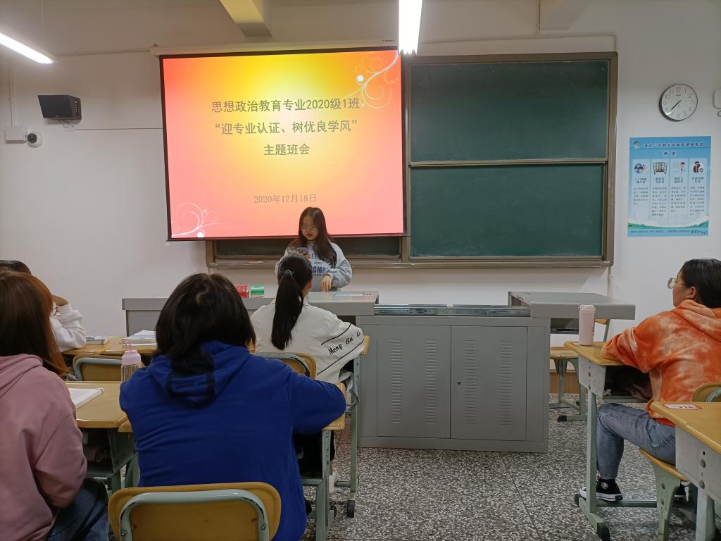 为推动师范类专业注重内涵建设,不断提高专业人才培养能力和质量,推动专业认证工作顺利进行。2020年12月18日7时,2020级思想政治教育1班在13教404室开展了“迎专业认证,树优良学风”主题班会,此次班会由班主任孙先文老师组织开展,全体同学参加。