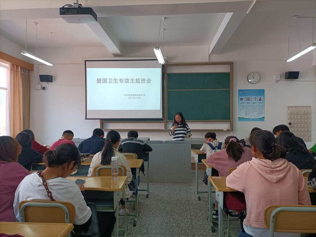 为提高我校师生疫情防控安全意识以及积极响应国家提出的深入开展爱国卫生运动,创造一个优美、整洁、卫生、舒适的工作、学习和生活环境,保障全校师生员工的身心健康。2021年4月9日,2020级思想政治教育1班在13教402教室开展爱国卫生专项行动教育主题班会,此次班会由班长陈曦组织召开,20级政教1班全体同学共同参与。