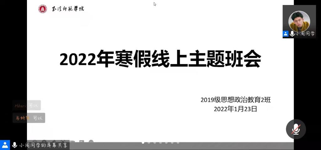 春节临近,为增强学生的安全意识以及督促同学合理安排假期时间进行有效学习,2019级思想政治教育2班于2022年1月23日20时召开线上主题班会,本次班会由班主任周鑫老师主持,全体同学参加。