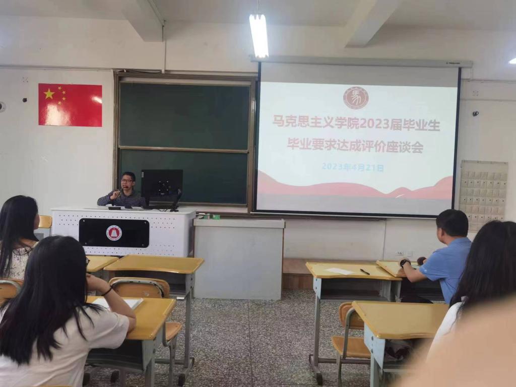 为深入分析马克思主义学院思想政治教育专业人才培养情况,推进专业内涵式建设与发展,保障和提高人才培养质量,有效评价专业毕业要求的合理性,2023年4月21日,我院在13教111室举办了马克思主义学院2023届毕业生毕业要求达成评价座谈会。本次会议由马克思主义学院副院长邱国成主讲,马克思主义学院辅导员马丽娟和2019级全体毕业生共同参与。