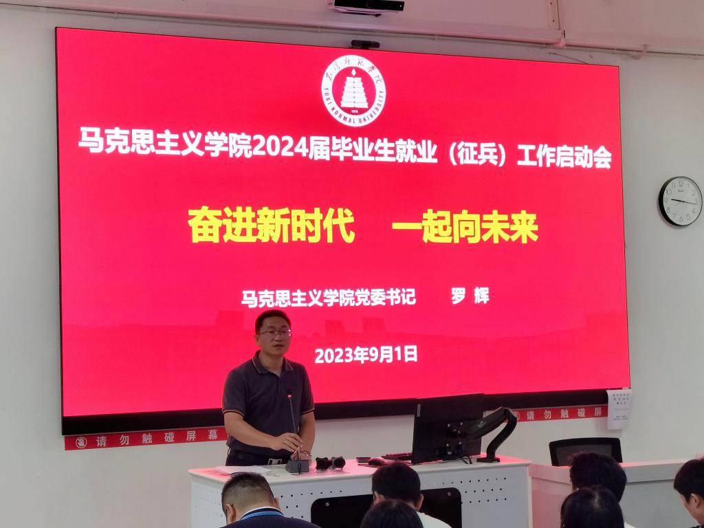 为引导2024届毕业生树立正确的就业观念,提高就业积极性和主动性,我院于2023年9月1日10:00在14教106教室举行2024届毕业生就业工作动员暨征兵工作动员大会。本次会议由副院长杨少英支持,马克思主义学院党委书记罗辉主讲,学院党政领导班子成员、实习带队教师、考研指导教师、2024届思想政治教育专业120余名毕业生参加了此次会议。