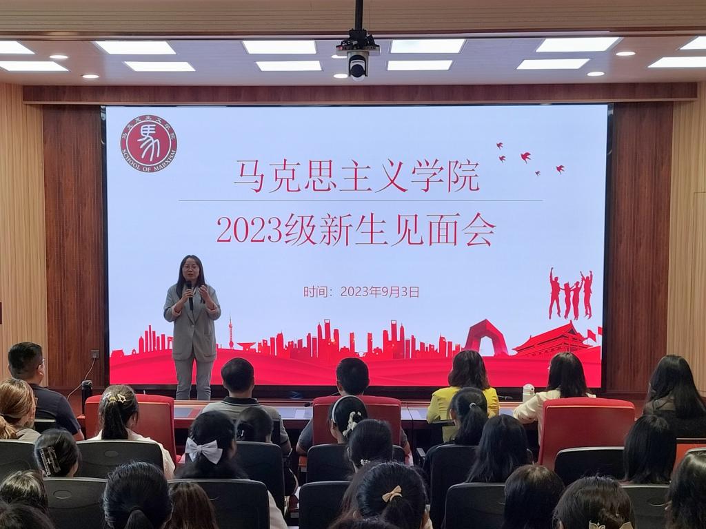 为帮助马克思主义学院思想政治教育专业2023级新生尽快转变身份,适应大学生活,明确学习目标,2023年9月3日上午10点,马克思主义学院在四耳报告厅举行2023级新生见面会。马克思主义学院党委书记罗辉、院长时遂营、党委副书记李铁、副院长杨少英、副院长邱国成、辅导员梁亚萌、教学秘书龙佳、组织员朱俊龙、专业负责人杨方、新生班主任李正东、高永德以及106名2023级新生参加此次会议,会议由学院团委书记马丽娟主持。