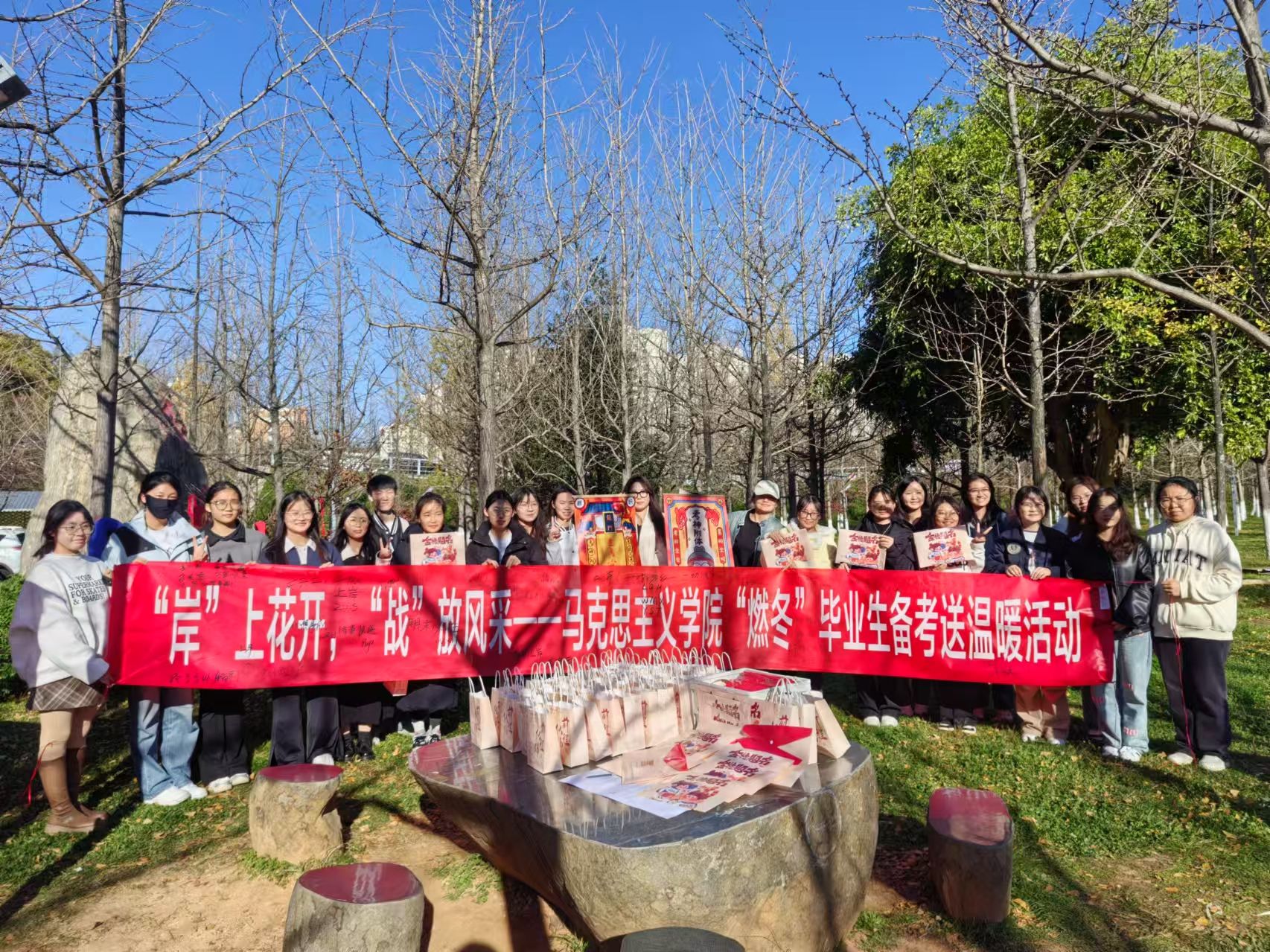 为助力25届毕业生积极备考,缓解备考压力,马克思主义学院于2024年12月13日15时在图书馆银杏林举办“‘岸’上花开,‘战’放风采”“燃冬”毕业生备考送温暖活动,让我们一同见证这份温暖的传递。