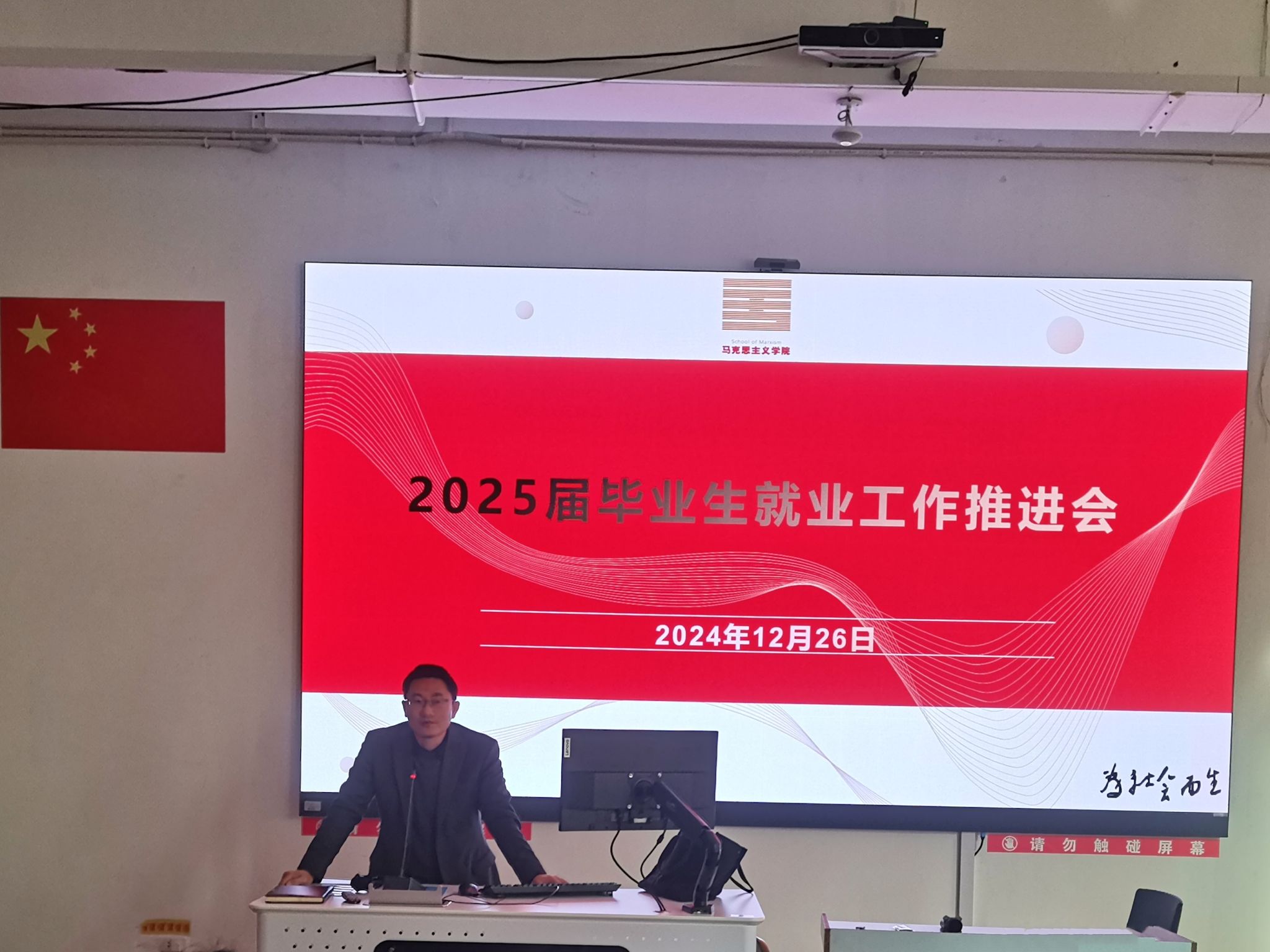 为做好2025届毕业生就业指导和服务工作,认真落实云南省普通高校毕业生就业创业工作会议精神和我校毕业生就业工作会议精神,推进我院毕业生高质量充分就业,2024年12月26日下午,马克思主义学院在14教105室召开2025届毕业生就业工作推进会。学院党委书记罗辉、党委副书记李铁、辅导员马丽娟、毕业班班主任张馨月、马尧晗,以及2025届毕业班全体学生参加了本次会议,会议由党委书记罗辉主持。
