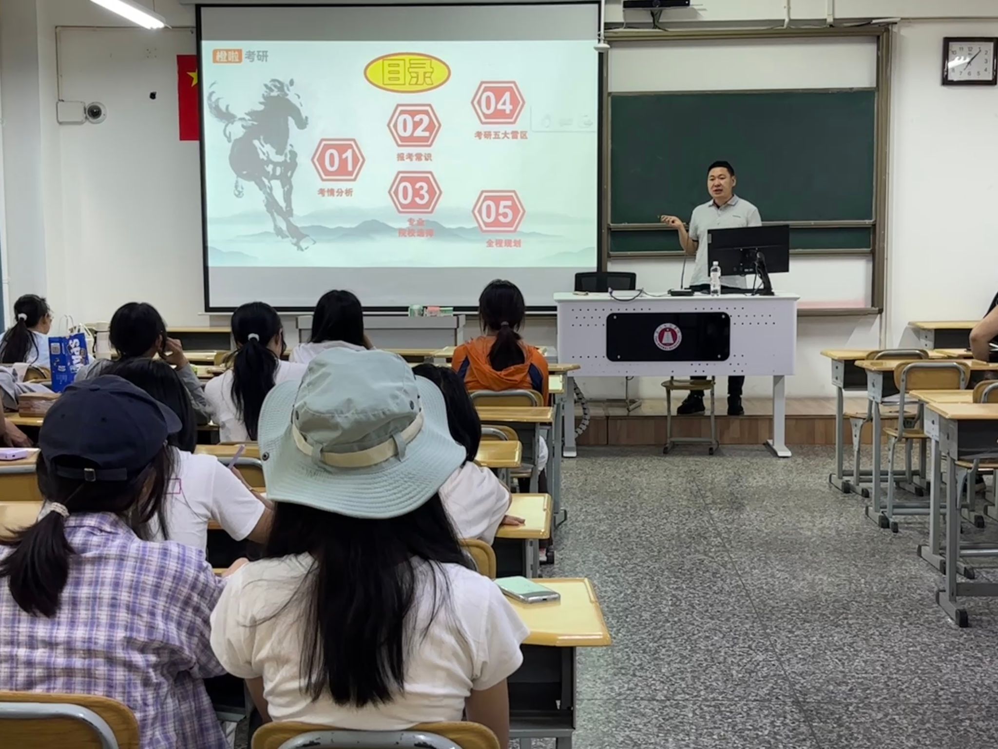 动员会中,王万胜老师以“为梦想而战”为主题,从报考常识的解读,到专业院校选择的策略,对当前的考研形势进行了全面而深入的剖析。他结合详实的数据和生动的案例,为同学们清晰地展现了考研的整体趋势、竞争态势以及机遇挑战,使大家对考研大环境有了更为直观和深刻的认识。