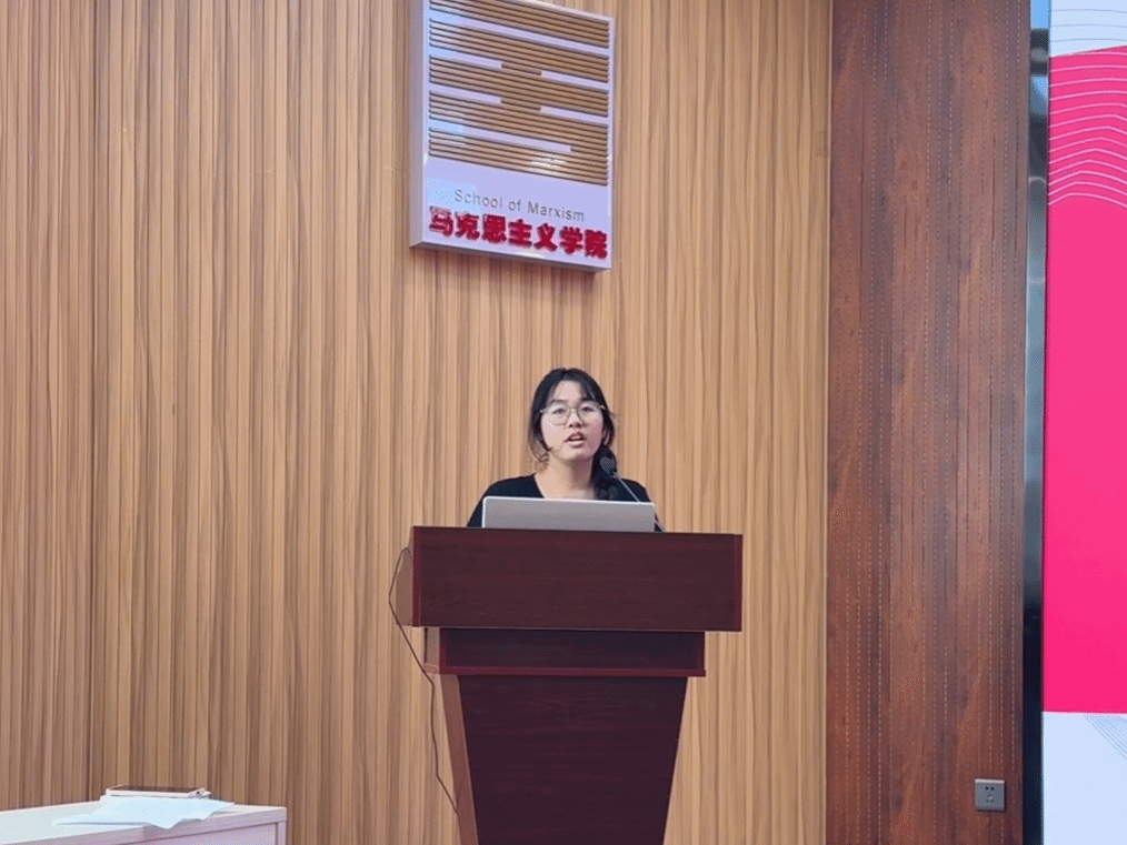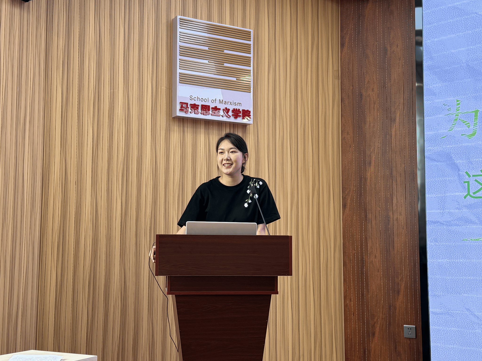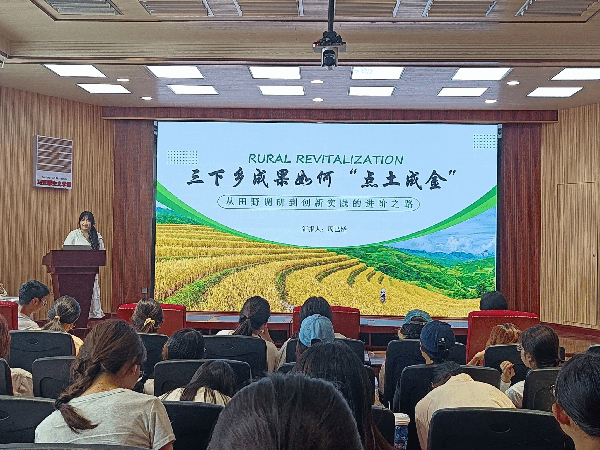 最后,“石榴红”边疆民族团结实践团成员周已娇同学以“从田野调研到创新实践”为主题,剖析了三下乡实践的价值转化。她将实践比作“带刺的玫瑰”,强调短期磨砺带来长期成长,并分享了将调研成果转化为创新项目的经验。她鼓励青年学子通过深入调研,读懂中国,将论文写在祖国大地上。