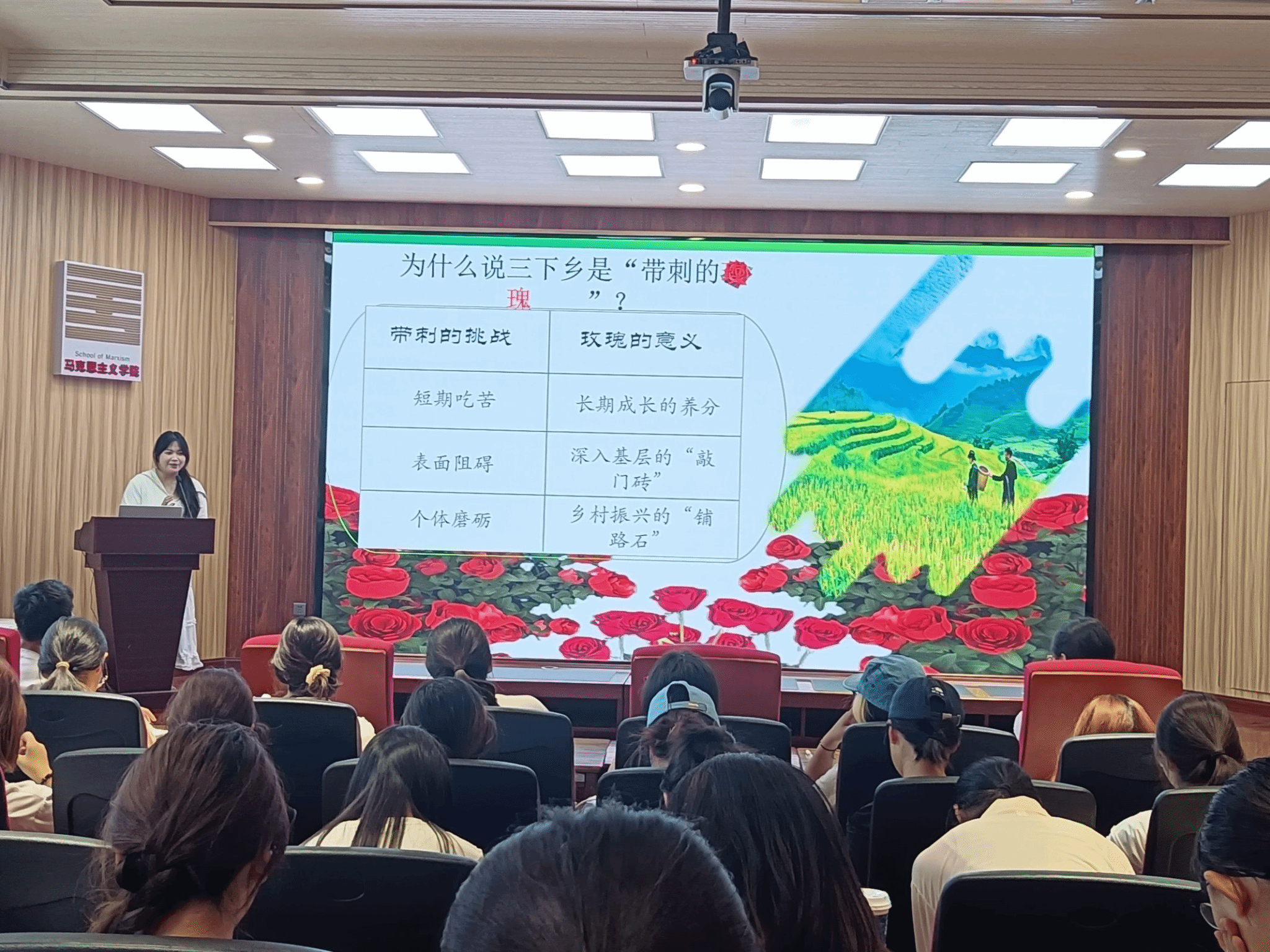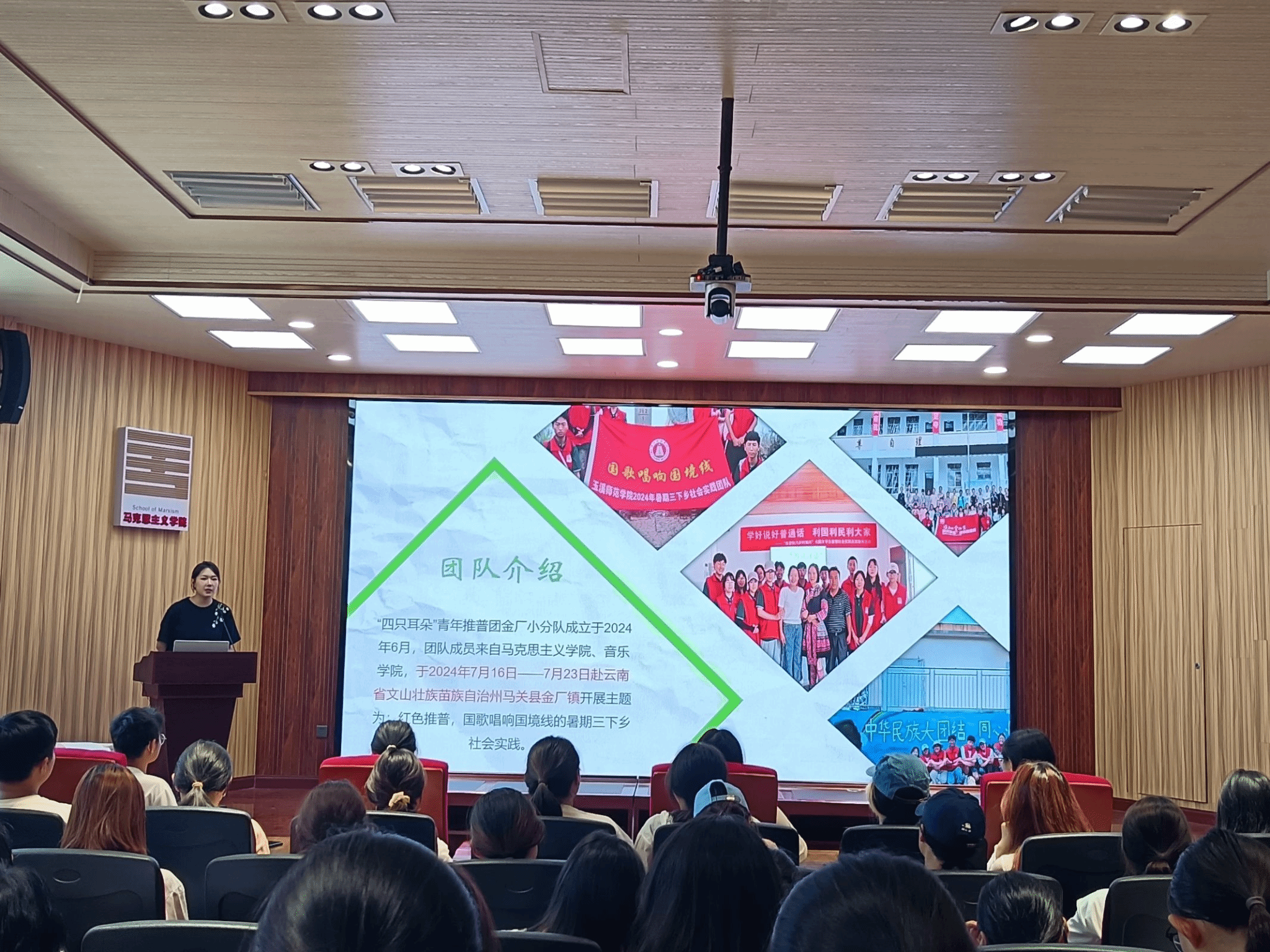 为积极响应国家关于大学生暑期社会实践的号召,鼓励青年学子投身社会实践,马克思主义学院于5月20日17:00在四耳报告厅举办了2025年暑期社会实践活动动员大会。本次动员会邀请了2024年暑期社会实践活动调研组长张欣然、“四只耳朵”青年推普团金厂小分队队长郭昕瑶、 “石榴红”边疆民族团结实践团成员周已娇三位同学对即将到来的暑期社会实践进行详细讲解,2024级全体同学参与。