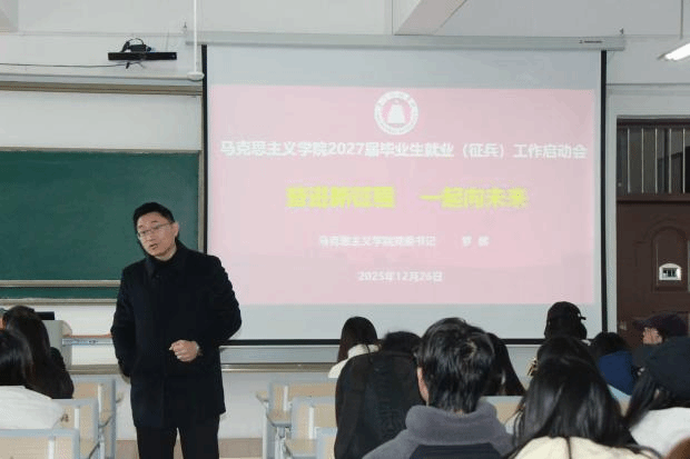 为帮助2023级学生明确发展方向、提早规划职业生涯,2025年12月26日11:00,马克思主义学院于11教103室召开2027届毕业生就业(征兵)工作动员会。学院党委书记罗辉担任主讲,他围绕就业形势、发展路径与阶段任务等内容,为2023级全体学生进行了系统指导。