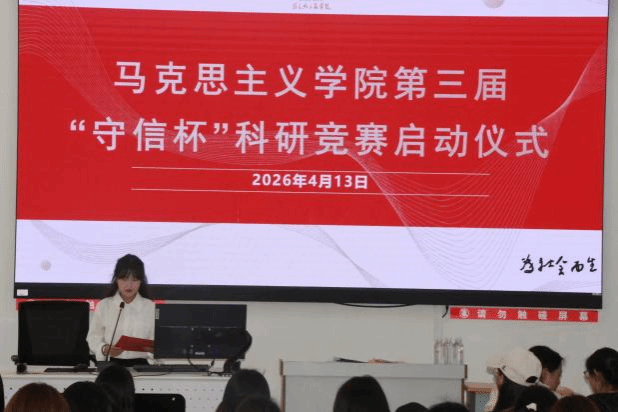 为激发学生创新创业意识,提升科研实践与项目研究能力,培育高质量创新创业训练项目,2026年4月13日16时,马克思主义学院于14教102教室举办第三届“守信杯”科研竞赛启动仪式。学院副院长杨少英、团委书记杨亚、往届优秀立项项目指导教师梁亚萌,以及优秀学生项目代表出席仪式,2024级、2025级全体同学参加本次活动。