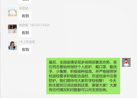 最后,学生党支部书记段妍智叮嘱全国疫情呈现多地局部暴发态势,各位同志要始终做好个人防护,戴口罩、勤洗手、少集聚,积极接种疫苗。并严格按照学校返校要求积极配合返校,在返校途中注意防护。